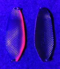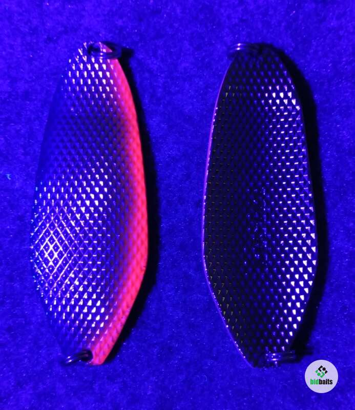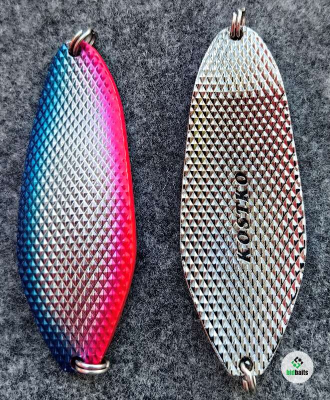 Большая масса 45гр, вытянутая форма 80мм, толщина 4,2мм, поверхность, состоящая из пирамидок с обоих сторон блесны, придающая в быстром потоке воды шумовой акустический эффект, который очень сильно привлекает рыбу и провоцирует на атаку. Блесна оснащены двумя заводными кольцами.