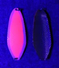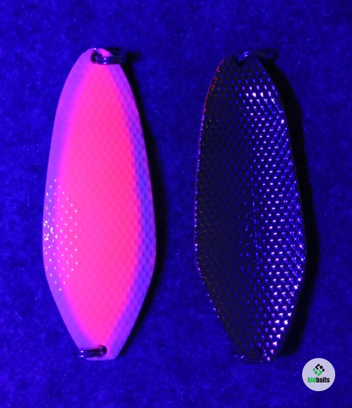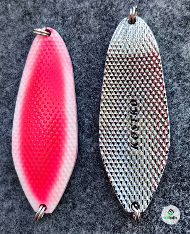 Большая масса 45гр, вытянутая форма 80мм, толщина 4,2мм, поверхность, состоящая из пирамидок с обоих сторон блесны, придающая в быстром потоке воды шумовой акустический эффект, который очень сильно привлекает рыбу и провоцирует на атаку. Блесна оснащены двумя заводными кольцами.