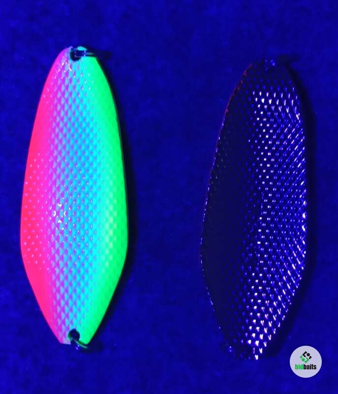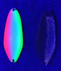 Большая масса 45гр, вытянутая форма 80мм, толщина 4,2мм, поверхность, состоящая из пирамидок с обоих сторон блесны, придающая в быстром потоке воды шумовой акустический эффект, который очень сильно привлекает рыбу и провоцирует на атаку. Блесна оснащены двумя заводными кольцами.