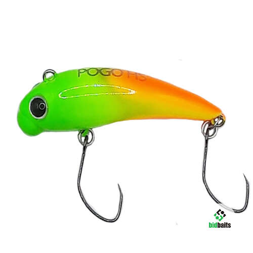 Mukai Pogo 38 HS - раттлин для ловли прудовой форели, имеет вольфрамовую огрузку в головной части, в результате чего приманка всегда падает на дно головой вниз, при этом хвостовая часть приподнимается в воде и медленно покачивается влево-вправо. Приманка подходит для ловли пассивной форели со дна рывковыми проводками и волочением по дну. Виб оснащен двумя одинарными безбородыми крючками.