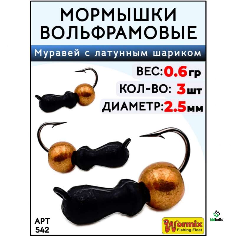Wormix Муравей с латунным шариком - это мормышка универсальной формы, которая подойдет для ловли практически любой рыбы в зимний период - начиная от плотвы или уклейки со средней глубины, заканчивая лещём и карпом со дна. Эту модель можно использовать для ловли на мотыля, а также, благодаря особой анимации, Муравей с латунным шариком уместен в качестве безмотылки. Он легко погружается на глубину от 3 метров.