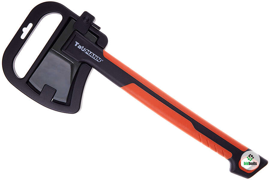 Рукоятка топора выполнена из ударопрочного, морозостойкого пластика с длинными вставками из термопластичной резины, которые обеспечивают комфортный и надежный хват, а также снижают ударные нагрузки на кисть руки. Выступ на конце ручки предотвращает выскальзывание топора из замершей или мокрой руки пользователя. Оранжевый цвет вставок делает топор хорошо заметным. Топор комплектуется пластиковым чехлом для его хранения и перевозки.