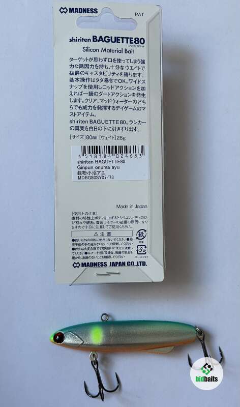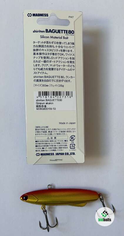 Вес: 28 гр.Длина: 80 мм Плавучесть: тонущий Заглубление: 0,0-12,0 м. Крючок, #6 Количество крючков: 2 шт. Вид ловли: джиг, ловля со льда Воблер Madness Shiriten Baguette это уже легендарная приманка из эластичного силикона, подходящая для ловли спиннингом и в отвес зимой со льда. Материал при этом довольно прочный и выдерживает много поклевок. Бесшумный воблер с металлическим стержнем внутри обладает отличными полётными характеристиками и способен ловить даже в очень глубоких местах водоёма за счёт своего веса. Средние взмахи и покачивания в рыбалке со льда регулярно приносят трофейного судака и щуку. Она привлекает рыбу интенсивными вибрациями во время проводки. Baguette подходит для ловли щуки, крупного окуня, судака в любой сезон.«Батон», а именно так его называют в простонародье, обладает низкоамплитудной игрой, которая с больших расстояний приманивает судака и щуку. Острейшие крючки и надёжная фурнитура будут крепко держать вашего трофея и не позволят ему сойти. Выпускается в размере 70,80 и 90 мм.