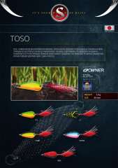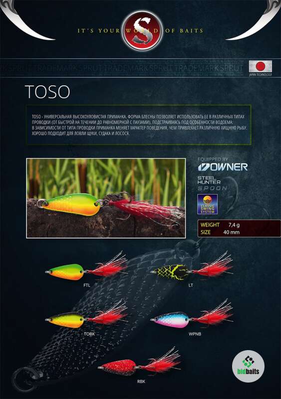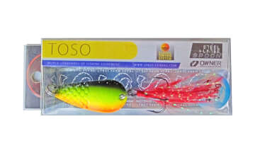TOSO - универсальная высокоуловистая приманка. Форма блесны позволяет использовать ее в различных типах проводки (от быстрой на течении до равномерной с паузами), подстраиваясь под особенности водоема: в зависимости от типа проводки приманка меняет характер поведения, чем привлекает различную хищную рыбу. Хорошо подходит для ловли щуки, судака и лосося.