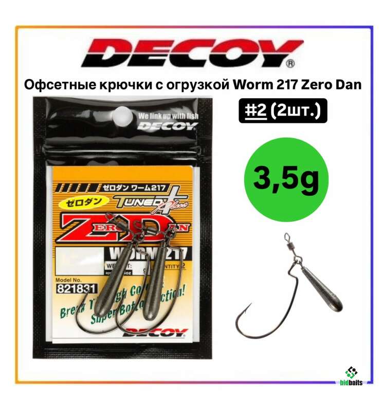 DECOY WORM 217 Zero Dan — серия специальных офсетных крючков для ловли донной оснасткой. Оснастка состоит из качественного офсетного крючка. грузила и карабина. При ловле такой оснасткой можно использовать большинство видов силиконовых приманок. Рекомендуется медленная проводка с постоянными небольшими подергиваниями спиннинга. Такая проводка способна спровоцировать даже пассивного хищника.