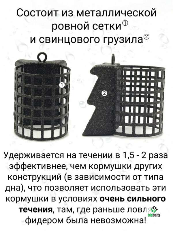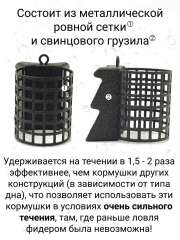 Сетка кормушки изготовлена из нержавеющей стали, что обеспечивает долговечность и устойчивость к коррозии. Грузило кормушки выполнено из свинца марки С1. После всех циклов изготовления, кормушка красится порошковой краской.