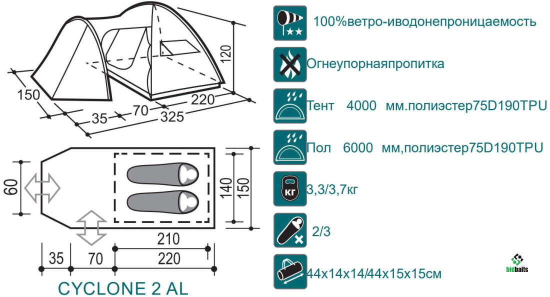 Алюминиевые дуги, тамбур с двумя входами, увеличенные вентиляционные окна в палатке.
