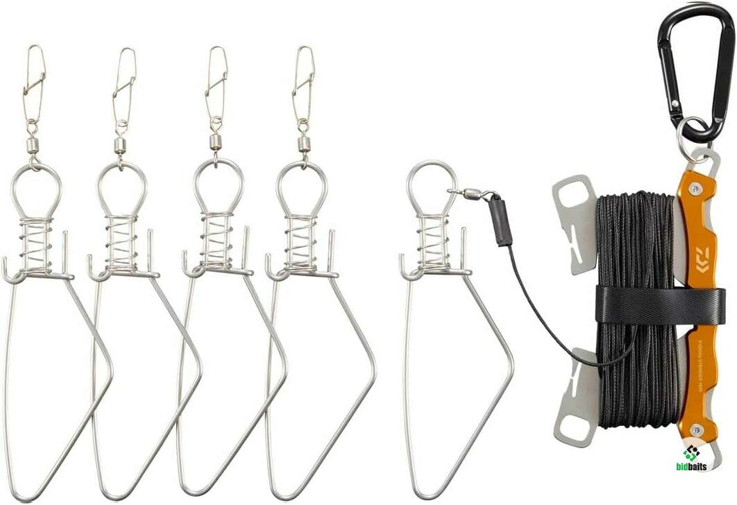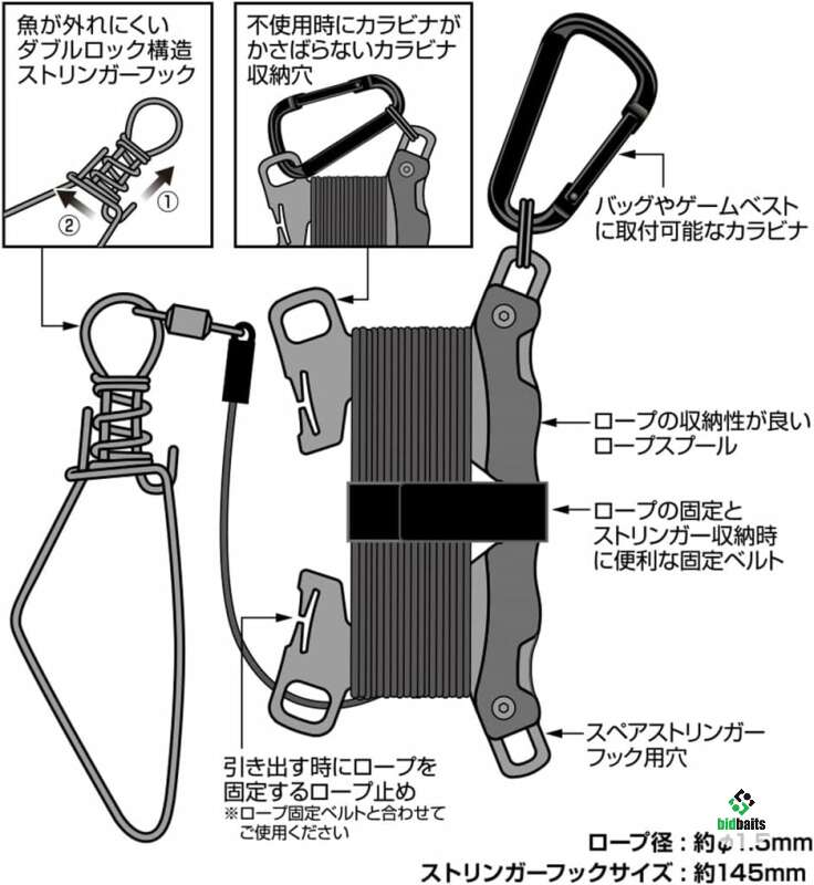 Крючок-стрингер с двойным фиксатором предотвращает выпадение рыбы и поставляется с держателем для веревки для удобного хранения и переноски.