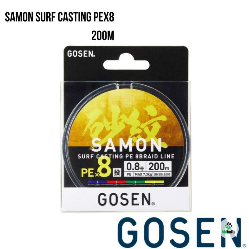 8-х жильный со специальным полимерным покрытием плетёный шнур GOSEN SAMON SURF CASTING PE 8 BRAID LINE # 0.8 (max 7.3kg) размотка 200m, 4-х цветный, каждые 25м (синий, красный, зелёный, жёлтый). Применёна новая технология изготовления- micro-pitch manufacturing method. Благодаря этой технологии шнур имеет эластичность, повышенную дальность заброса и износостойкость.