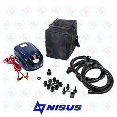Электрический насос NISUS N-GP-80 - двухступенчатый насос высокого давления N-GP-80 работает только от внешнего аккумулятора 12 В. Диапазон давления – 0,1÷0,8 Bar с шагом 0, 05 Bar. Подходит для накачивания/сдувания надувных лодок ПВХ, РИБов, бассейнов, матрасов, аттракционов (в комплекте поставки – адаптер под вворачиваемый клапан и 9 переходников под воздушные клапаны различных диаметров). Механическая двухкамерная система накачки. При включении тумблера в первое положение крыльчатка нагнетает объем, затем включая второе положение тумблера, поршневой компрессор накачивает изделие до необходимого давления. На манометре отображается текущая величина давления. Корпус из высокопрочного пластика защищает механизмы насоса от повреждений при ударах, а сумка из водонепроницаемой ткани – от загрязнения, попадания влаги, образования потертостей, царапин и сколов на корпусе при транспортировке, хранении. Время накачивания лодки средних размеров (3,3 ÷ 3,6 м) составляет 5 ÷ 7 минут, сдувания - 4 ÷ 5 минут.