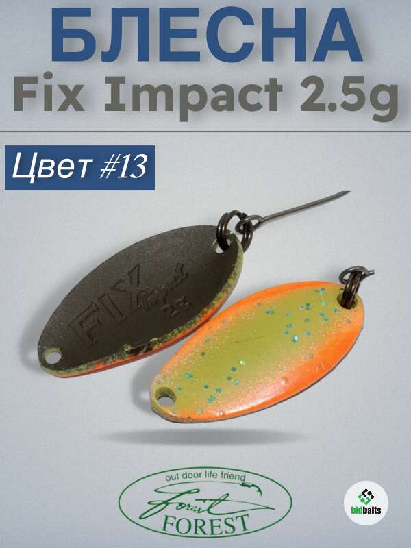 Forest Fix Impact – миниатюрная колеблющаяся блесна, разработанная для ловли форели на коммерческих водоемах. Хорошо проработанная геометрически, данная модель обладает выразительной игрой и позволяет спровоцировать на поклевку даже малоактивного хищника. Приманки обладают хорошим балансом формы и веса, оснащаются острейшим одинарным крючком. Широкая цветовая гамма позволяет подобрать рабочий вариант даже для пассивной форели. В зависимости от применяемого темпа проводки возможно изменение степени активности игры приманки, чем выше темп проводки, тем активней игра у приманки. На данную модель так же ловятся лосось, хариус, жерех, голавль, окунь, щука и другая хищная и белая рыба.