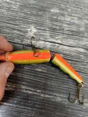 Отличный воблер. Дубль из коллекции. Упаковки нету. Оригинал. Rapala Jointed - это состоящая из двух элементов версия модели Original. Он является необычайной приманкой, которая прекрасно годится, как для спиннинга, так и для троллинга. Разница между воблерами Jointed и Original заключается в большей подвижности первого. Рекомендуется для ловли в воде с низкой температурой и когда рыба не клюет. Активно движущийся конец корпуса воблера провоцирует хищников к атаке. Jointed 5-7 см это популярная приманка для пугливой форели. Большие модели 11-13 см великолепно годятся для ловли щуки. Даже когда рыба совершенно безразлична ко всему, Вы можете усилить действие приманки, используя один из эффектных, раздражающих рыбу цветов. Jointed прекрасно ведет себя при переменной скорости подмотки, а также при очень медленном управлении или троллинге, без утери динамики его подвижности.