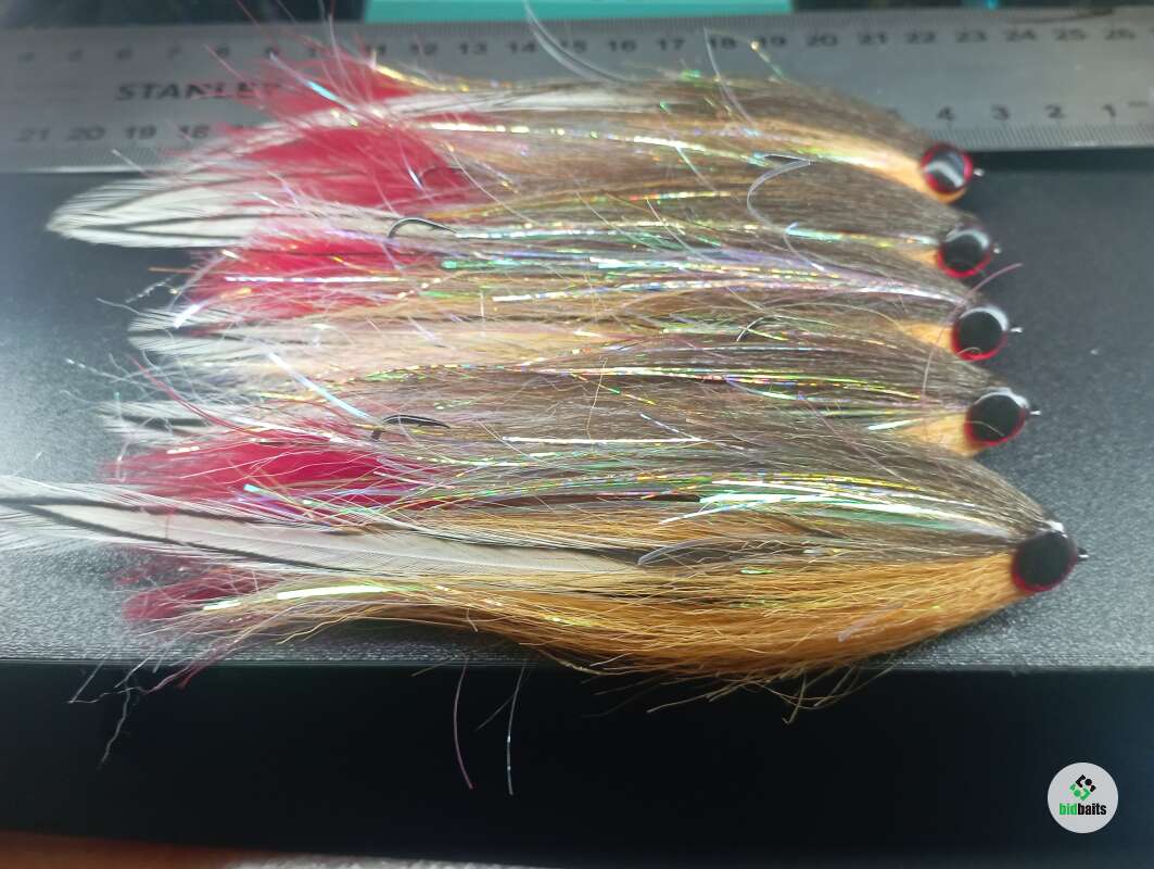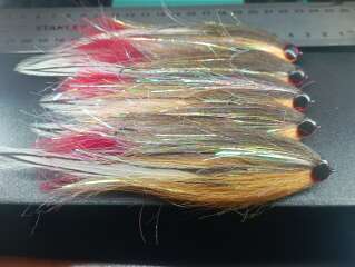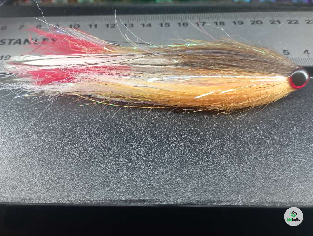 Стример связан на дух крючках №4 и 2\0. Основной материал Craft fur в цвете XCF377(белый), XCF228 (средне-коричневый) и XCF343 (креветочно-розовый), флэш-материалы Sybai Magnum Supreme + синель, перо - American Rooster Cape.