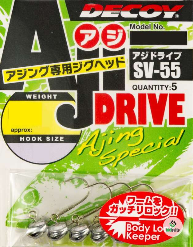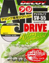 Decoy SV-55 Aji Drive - это джиг-головки, предназначенные для ловли разных видов рыбы небольшого размера. Данная модель снабжена пластиковым стопорком на цевье крючка для надежного удержания приманки. Форма крючка позволяет смело выполнять резкую, рывковую проводку. Эти джиг-головки отлично работают как в море - при ловле морских хищников, так и в пресной воде - при ловле окуня, чехони и пр. Крючок джиг-головки качественно заточен, поэтому сходы рыбы практически исключены.