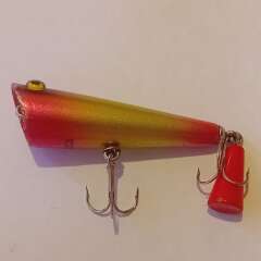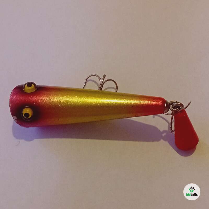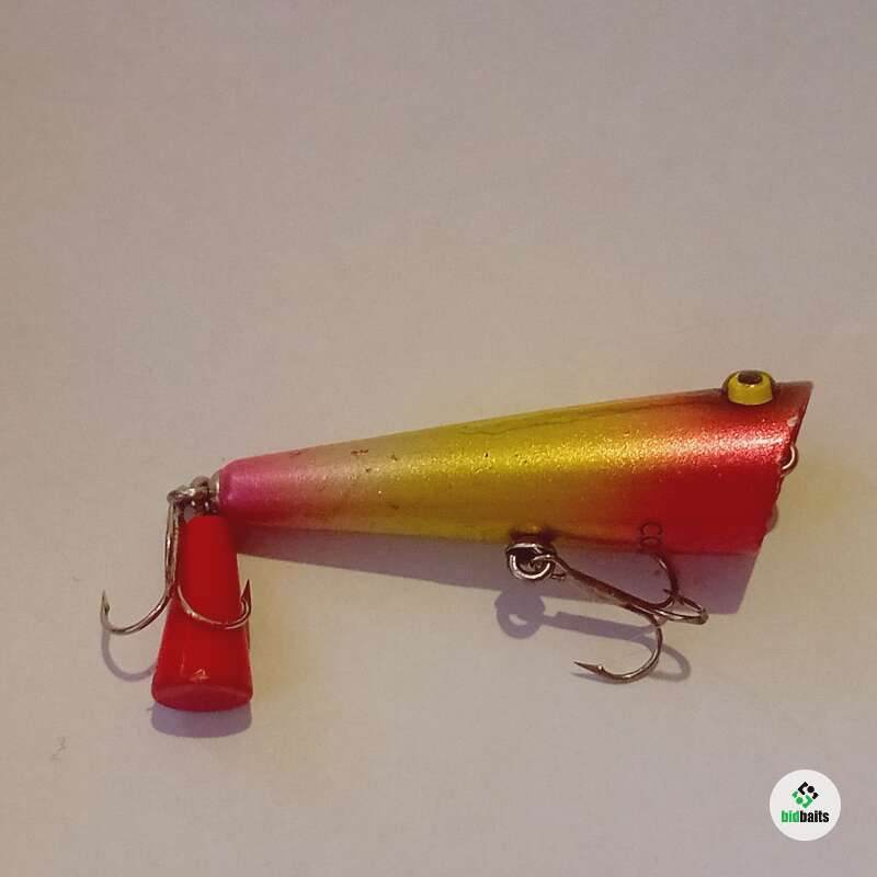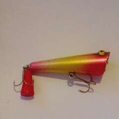 Плавающий поппер 65мм, 7,5гр. Состояние хорошее, есть незначительные сколы и трещина лакокрасочного покрытия в головной части, покрыты лаком.