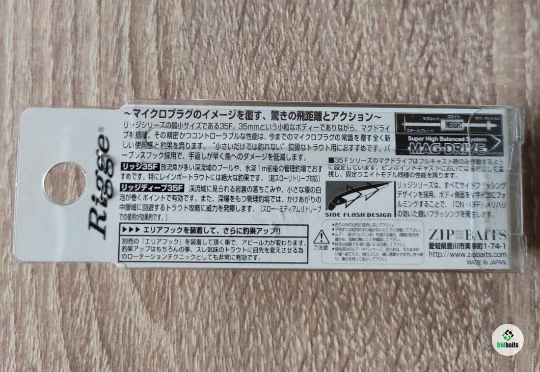 Воблер ZipBaits Rigge 35SS– это чрезвычайно популярная приманка для ультралайтовой ловли. SS в названии говорит о медленно тонущей вариации семейства Риджей. Хорошо работает при твичинге, а также равномерной проводке. Небольшие размеры и «мясистое» тело с горбинкой делает эту приманку предметом желания для многих видов рыб, причем не только хищных. Лопасть данной модели небольшая, и заглубить приманку удастся не более метра. Отражающая поверхность воблера имеет три основные направления, но в результате колебаний именно излучение по данным траекториям распространяется по разным участкам водоема сконцентрированным пучком. Конечно же, это сделано для большей заметности приманки. Воблер отлично сбалансирован, обладает привлекательной игрой. Система грузиков способствует как «правильному» качанию при проводке, так и увеличивает дальность полета при забросе.