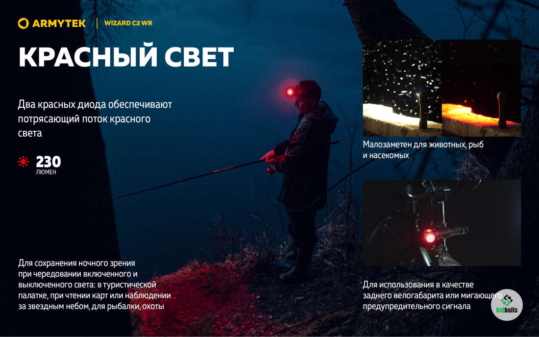 Красный свет малозаметен для животных, рыбы и насекомых, комфортен для ночного зрения.