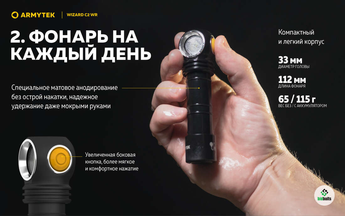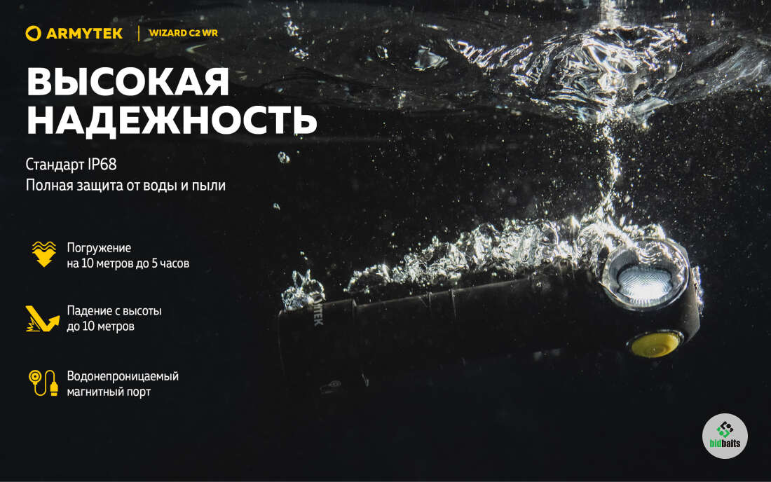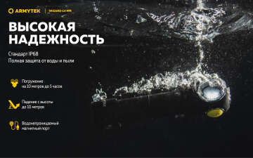 Полная защита от воды, грязи и пыли по стандарту IP68 — фонарь продолжает работать даже на глубине 10 метров. Выдерживает падение с высоты до 10 метров.