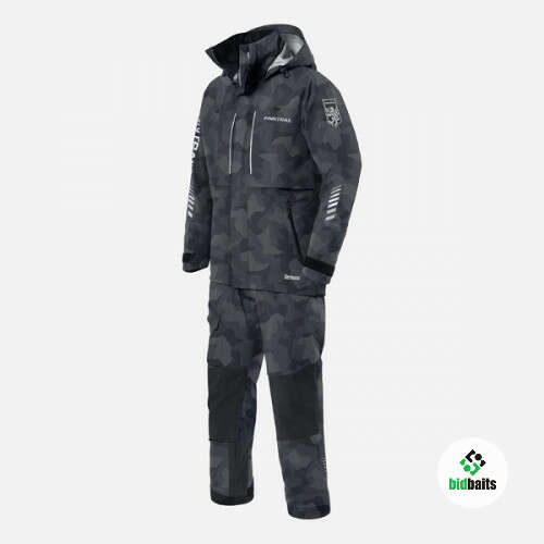 надёжно защищает от холода. Структура материала позволяет сохранять тепло и комфорт при температуре до -20°C. Комбинезон с артикулированным кроем учитывает анатомию человеческого тела и обеспечивает полную свободу движений. Функциональный дизайн модели объединяет в себе продуманные детали и оригинальный камуфляж в тёмных тонах. Центральная двухзамковая тракторная молния YKK с двумя планками на магнитных застёжках обеспечивает прочное соединение и защиту от воды и ветра. Высокий воротник с флисовой подкладкой не раздражает кожу и укрывает шею от ветра. Регулируемый капюшон с ламинированным козырьком позволяет настроить оптимальный объём. Куртка имеет четыре внешних кармана и два внутренних, один из которых можно использовать для гаджетов, а второй для головного убора. Внутренние манжеты на рукавах плотно прилегают к телу и легко регулируются до нужного объема. Максимально комфортная посадка достигается благодаря регулировки по низу куртки. С помощью прорезиненных элементов, расположенных на куртке, можно закрепить снасти и мелкий инструмент.