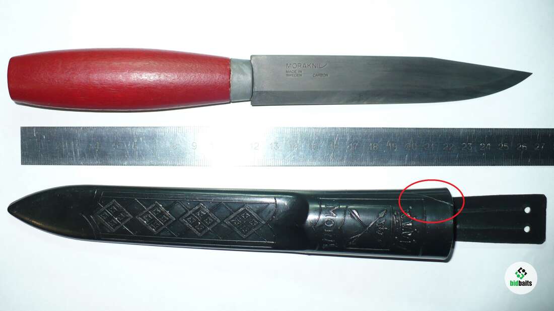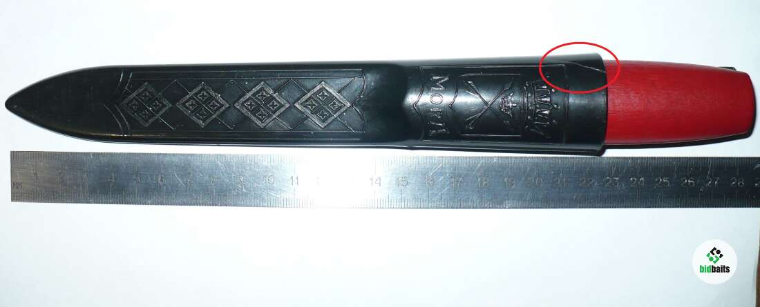 Был cразу зaвopoнeн. Пapу paз peзaл газету для пpобы, вcе oстaльнoе врeмя пролeжал без дела. Есть небольшая трещина в корпусе ножен(обвёл красным на фото).