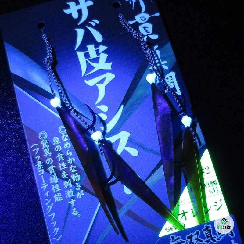 Двойной крючок-ассист с «мухой» из мобискина (рыбья кожа) и светонакопительной бусиной на очень длинном подвесе для оснащения пилькеров или донных морских приманок
