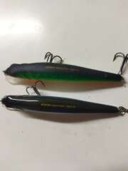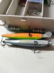 Продам два воблера,один в хорошем состоянии,у второго случайная дырка от крючка.Дырка не сквозная,воду не пьёт.Заклеивать не стал,думаю кто купит,капнет каплю секундного клея для профилактики.Продаются комплектом!