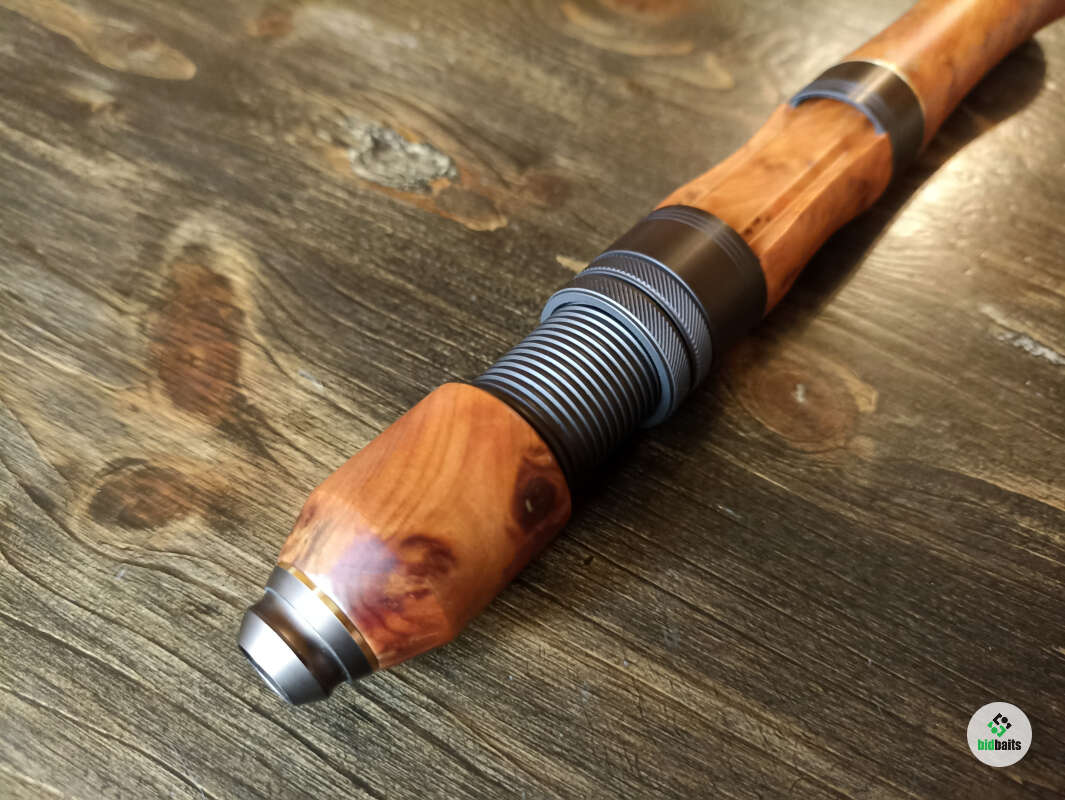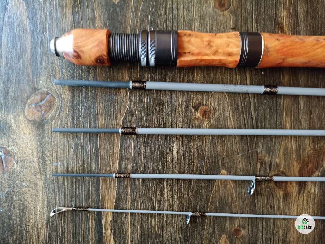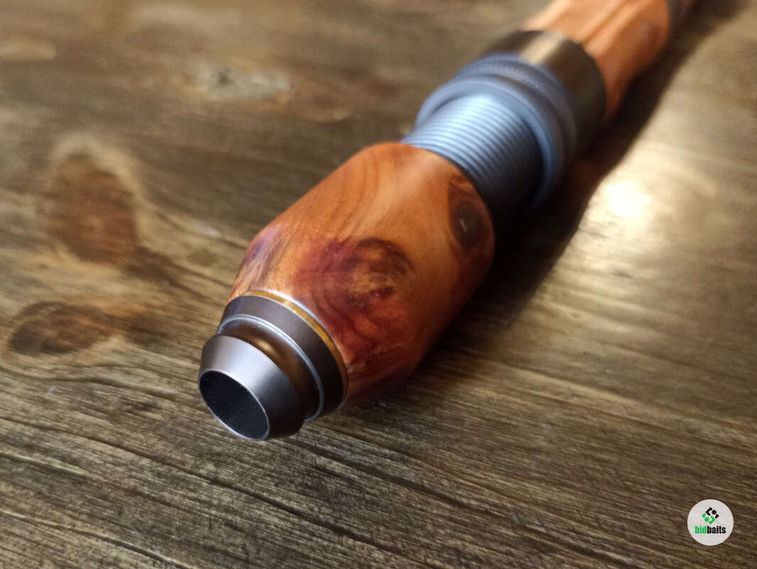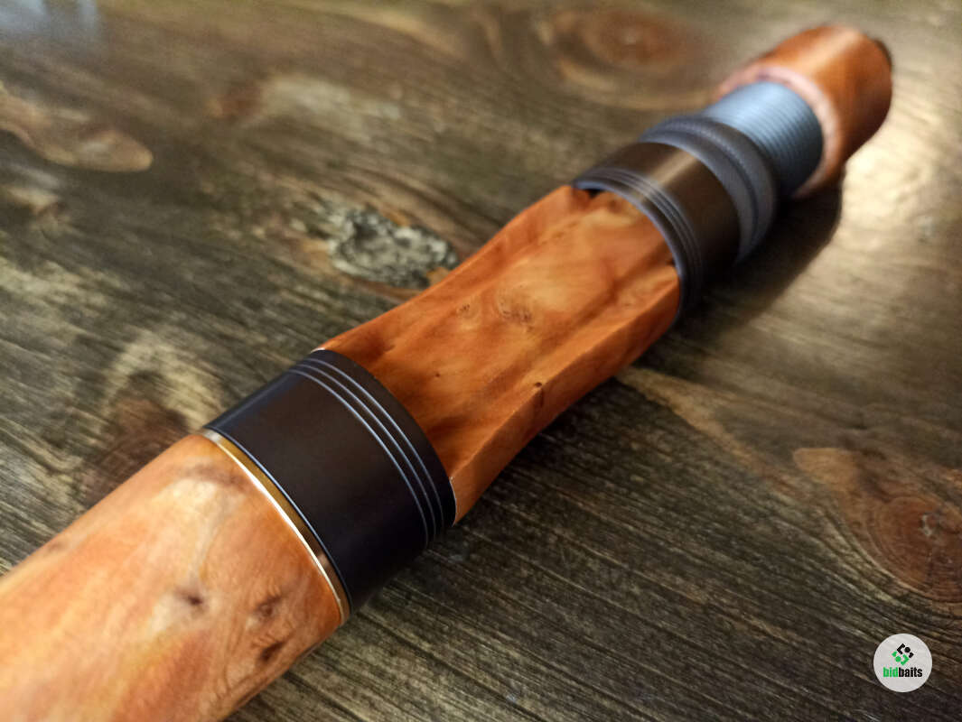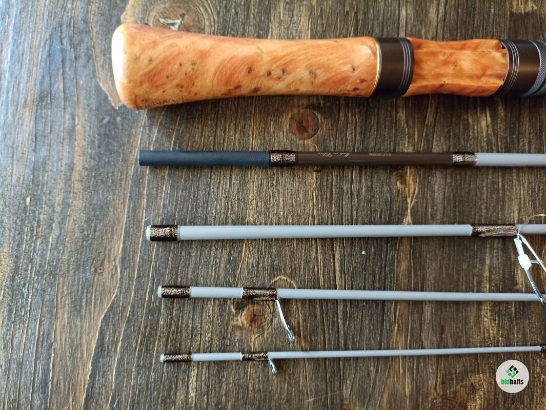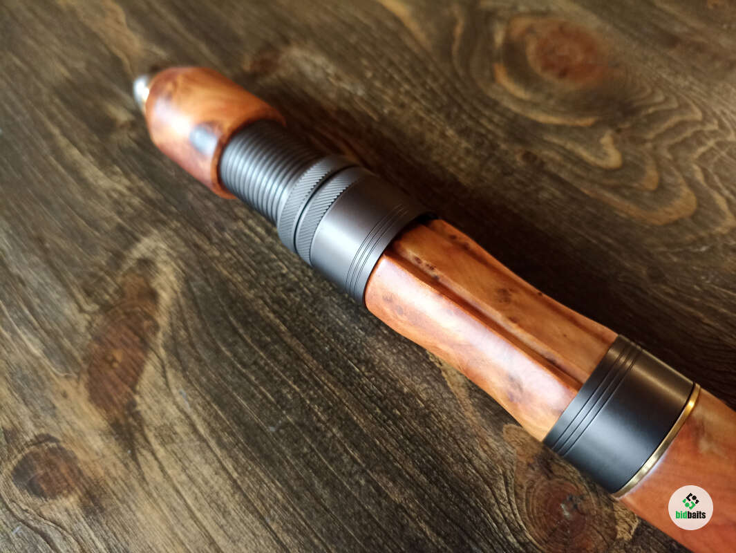 Шпиготное соединение частей бланка. Кольца SiC в рамках из нержавеющей стали. Катушкодержатель с верхним расположением гайки и контргайкой. Рукоять и вставка катушкодержателя из натурального стабилизированного дерева. Мягкий транспортировочный чехол.