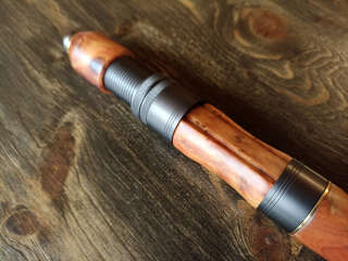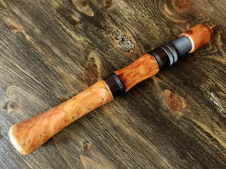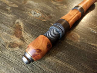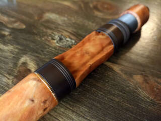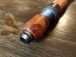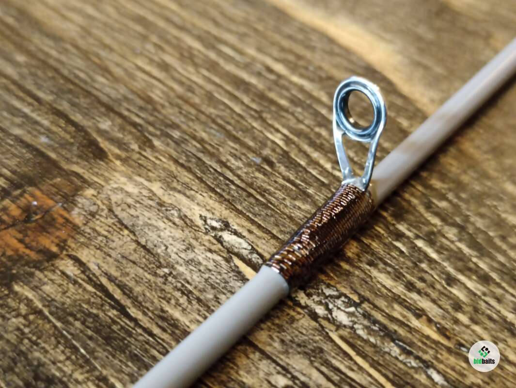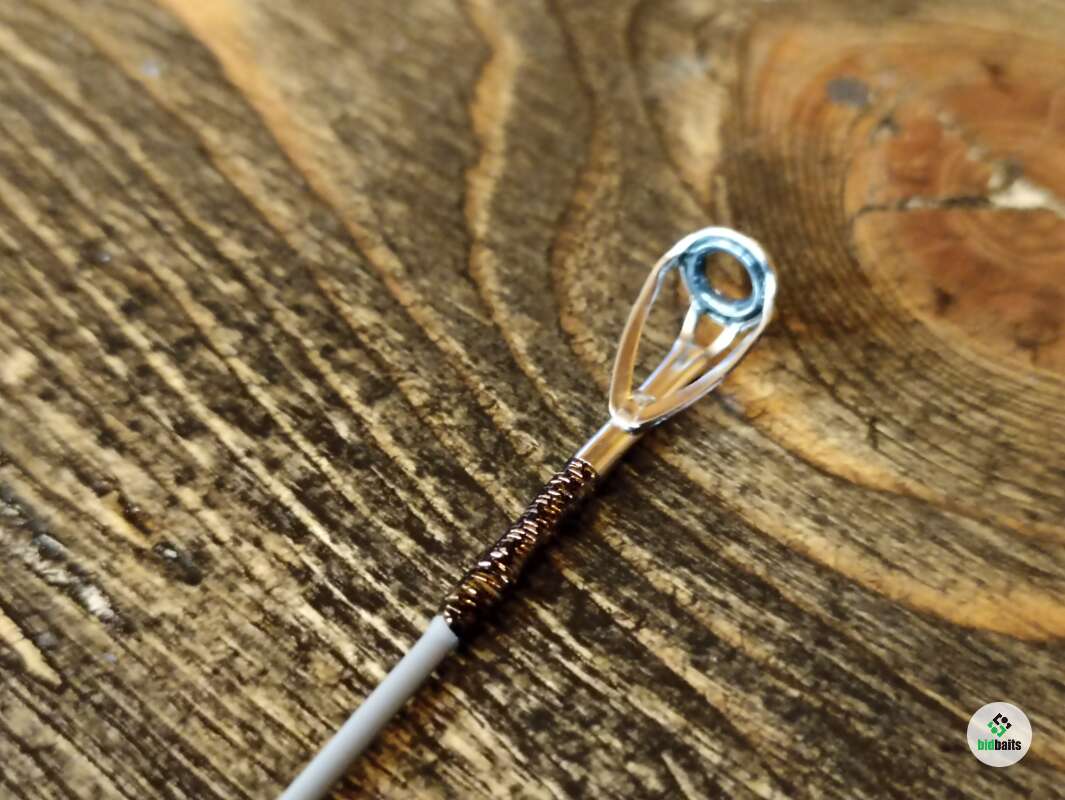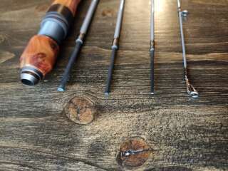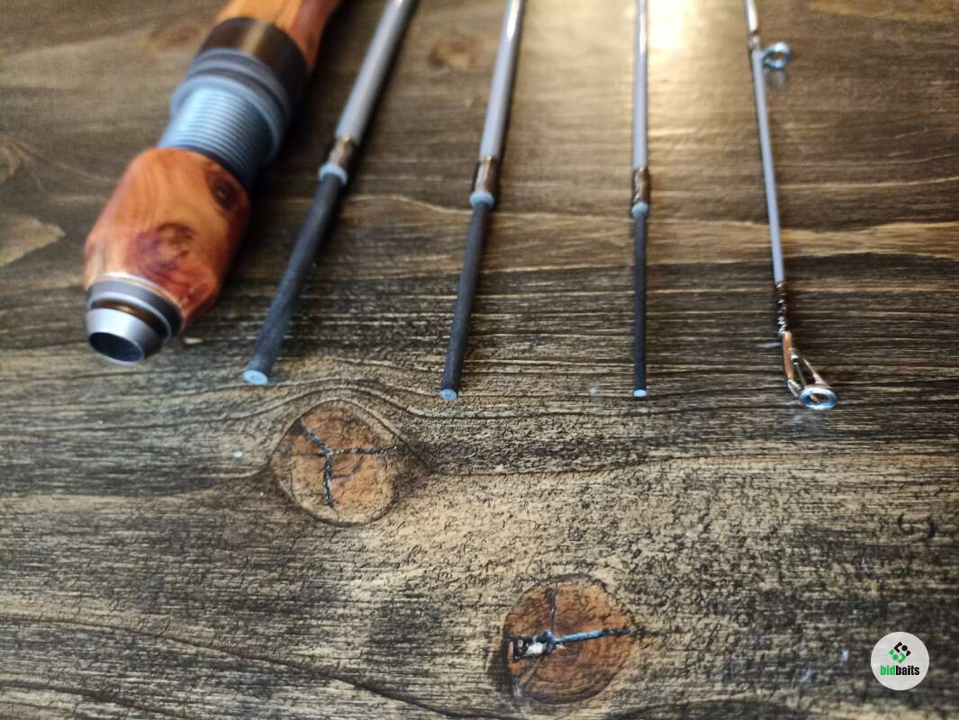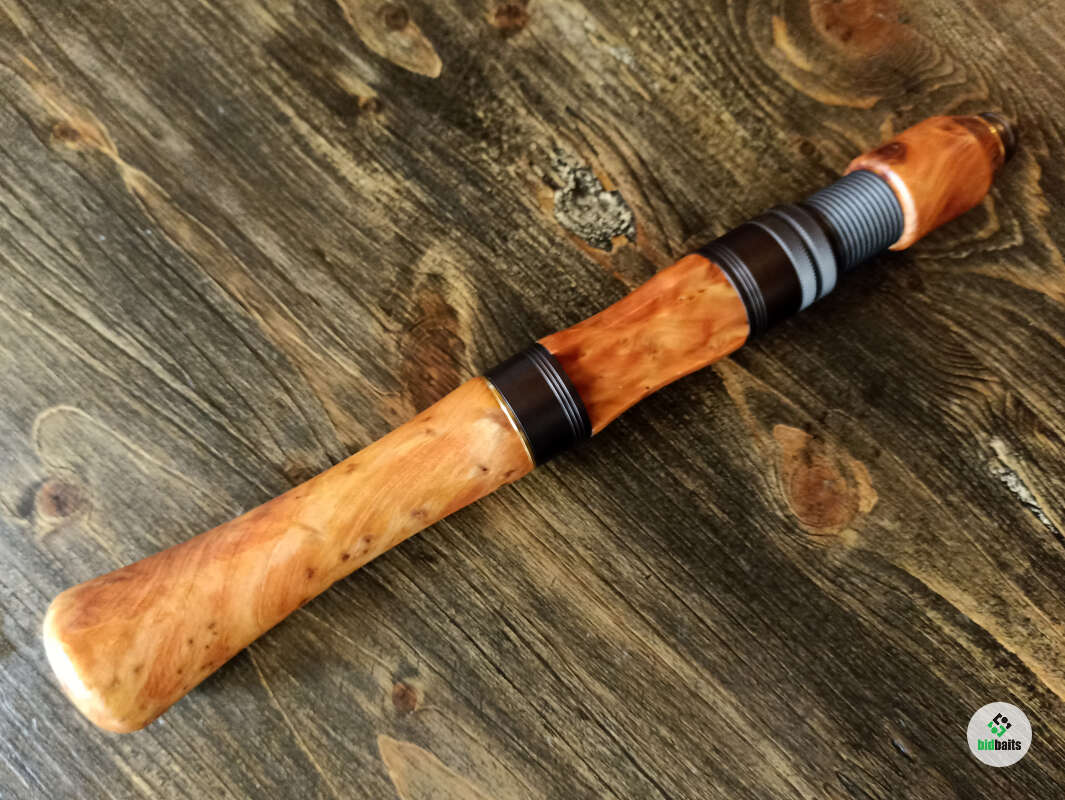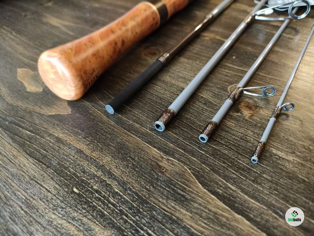 Шпиготное соединение частей бланка. Кольца SiC в рамках из нержавеющей стали. Катушкодержатель с верхним расположением гайки и контргайкой. Рукоять и вставка катушкодержателя из натурального стабилизированного дерева. Мягкий транспортировочный чехол.