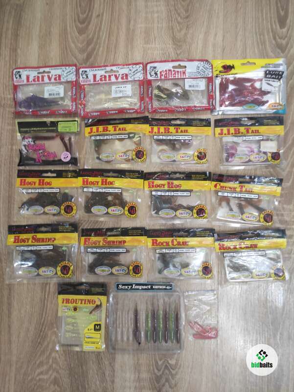 Мелкий силикон. Larva fanatic 2'' 2 уп .; Mik Maus fanatic 2''; Forktail Trailer 2,4''; crazy fish active slug 7,1 см; Lucky john J.I.B Tail 1,5'' 3 уп.; Lucky john Hogy Hog 2,1''; Lucky john Hogy Hog 1,6'' 2 уп.; Lucky john Chunk Tail 2''; Lucky john Hogy Shrimp 3'' 2 уп .; Lucky john Rock Craw 2'' и 2,8''; Lucky john Troutino 2,1'', Keitech sexy impact. Частично неполные пачки.