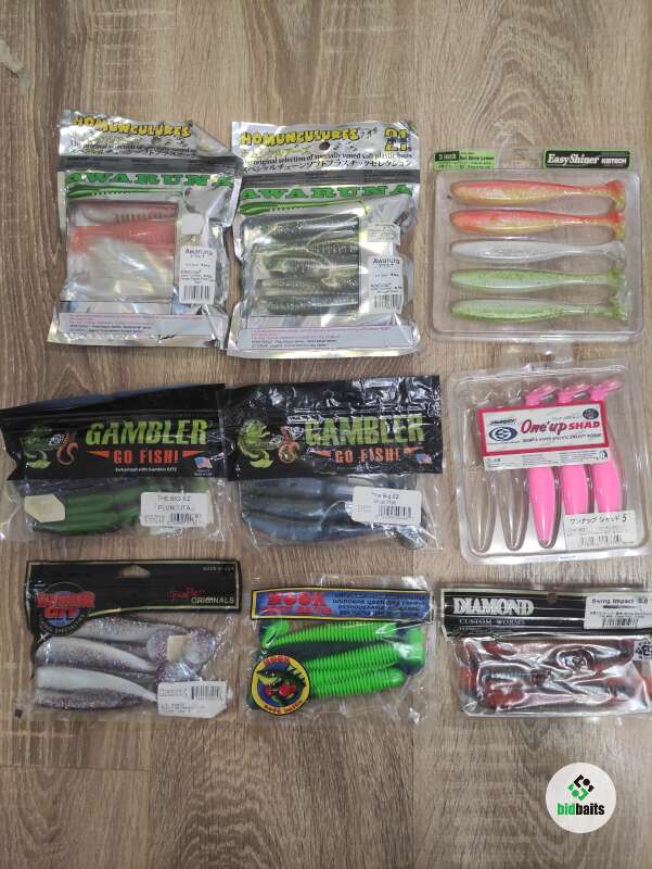 Фирменные силиконовые приманки. Р21 Awaruna 2 уп.; Keitech Easy Shiner 5''; Gambler the big EZ 5'' 2 уп .; Sawamura One UP Shad 5"; Linker city Shaker 5"; Hook soft Bait 5''; Diamond Swing Impact 5''. Частично неполные пачки.