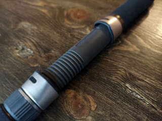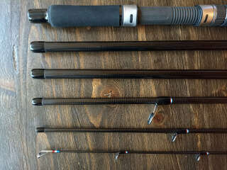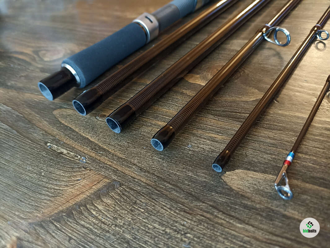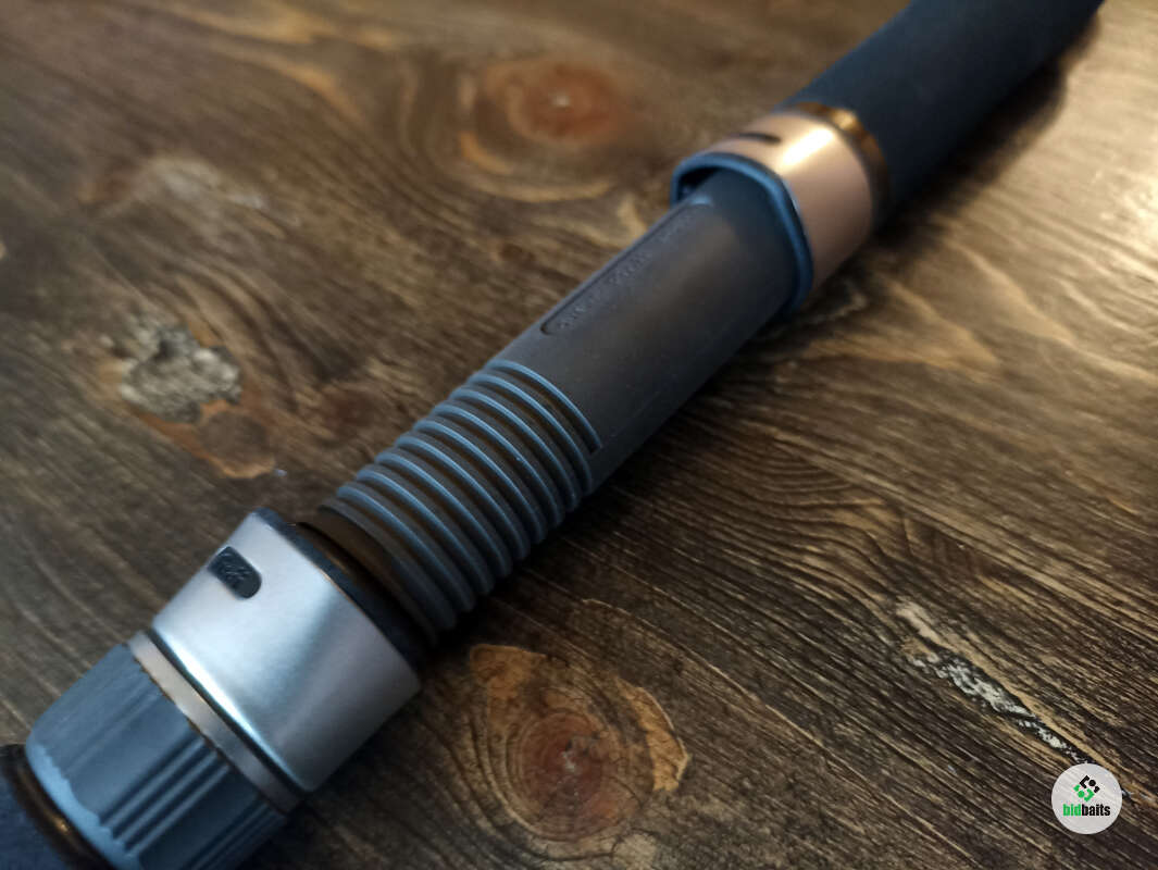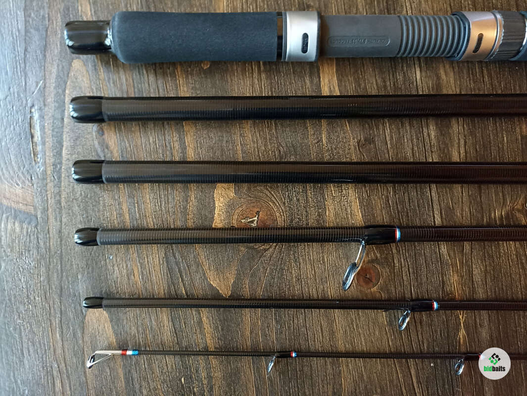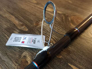 Кольца Fuji SiC и Torzite в направляющих из титана: кольцо тюльпана SiC, следующие 4 кольца Torzite, далее вниз все кольца SiC. Катушкодержатель с нижней гайкой и контргайкой. Рукоять из качественного EVA-материала. Передняя часть рукояти (до катушкодержателя) имеет длину 85 мм, задняя часть рукояти (после катушкодержателя) 340 мм. Такая длина рукояти облегчает заброс по низкой траектории, из неудобных положений. В комплекте мягкий транспортный чехол.