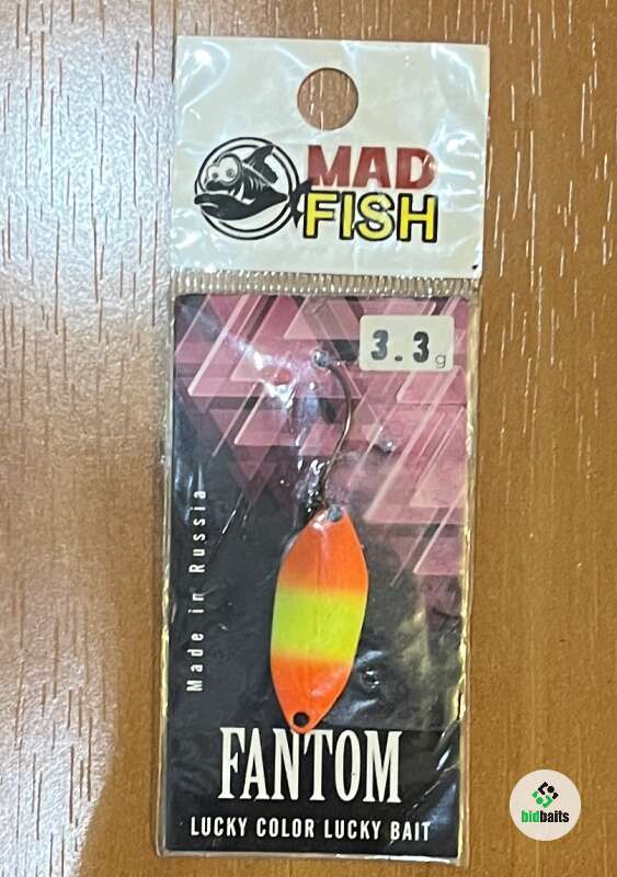 Блесна Mad Fish “Fantom” - 3,3 гр. Блесна «Fantom» классической формы, обладает прекрасными аэродинамическими свойствами. Вся её форма предназначена для дальнего заброса. Отлично зарекомендовала себя на больших акваториях. Рыскающая игра при проводке не оставит равнодушной ни одну рыбу. «Fantom» - одна из немногих блесен, которые прекрасно ведут себя при вертикальной проводке. При падении форма листа создает плавные колебания.
