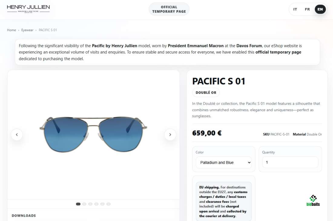 Солнечные очки, в которых президент Франции Эмманюэль Макрон выступал на Всемирном экономическом форуме в Давосе, вызвали значительное увеличение интереса к продуктам компании-производителя, Henry Jullien. Согласно данным радиостанции Franceinfo, сайт производителя оказался перегружен из-за большого наплыва посетителей. В последние дни представители компании получили множество звонков от заинтересованных покупателей.