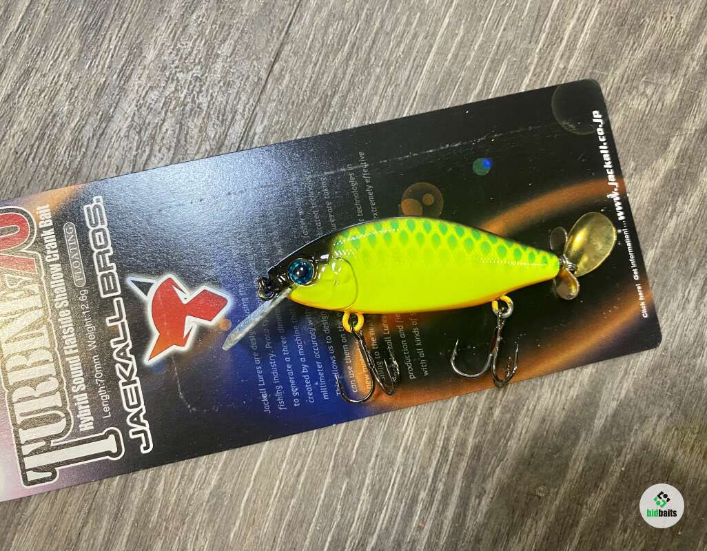 Особенностью Turbin от компании Jackall является совмещение пропеллера и лепестка в хвостовой части. Таким образом сочетание звукового и визуального эффекта, создаваемого этими элементами, делает игру приманки более правдоподобной.