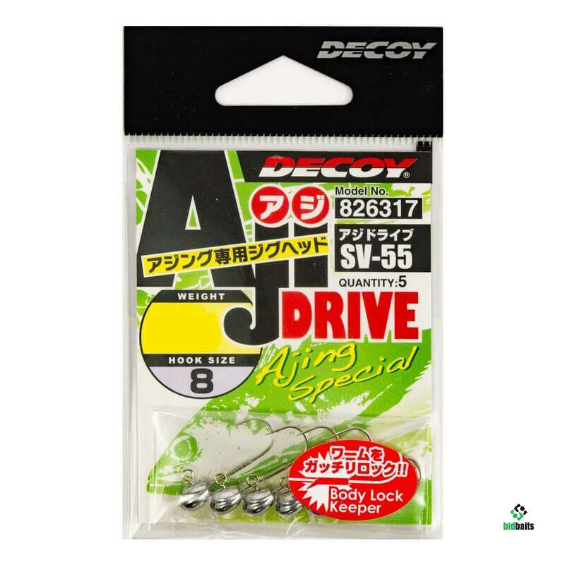 Джиг-головка Decoy Aji Drive SV-55 - подходит для ловли различных морских рыб, но изначально предназначена для ловли ставриды. Особо следует отметить специально разработанный «Body Lock Keeper», который предотвращает соскальзывание приманки.
