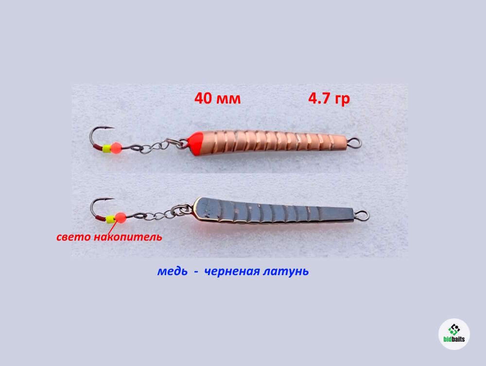 Новая модель блесны, имитация водных личинок. Короткий резкий дерг, ложится почти в горизонт, короткая сыпучка и падение с перевалками. Петли, колечки и паянная цепочка из нерж. проволоки. Отлично работает по даже пассивному окуню на глубинах 0.5 - 6 метров.