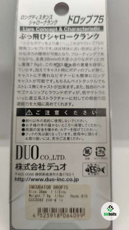 Воблер DUO Incubator Drop – объемный и короткий по длине кренк с возможностью заглубления до метра. Специфика формы и выверенная балансировка положительно влияют на полетные свойства, позволяют забросить приманку точно в намеченное место. Лопатка с шириной, соразмерной телу, и небольшим углом наклона позволяет приманке уверенно держать горизонт, сохранять устойчивость при всех скоростях проводки, создавать привлекательный рисунок игры. Плюсом является феноменальная устойчивость в самом мощном потоке.