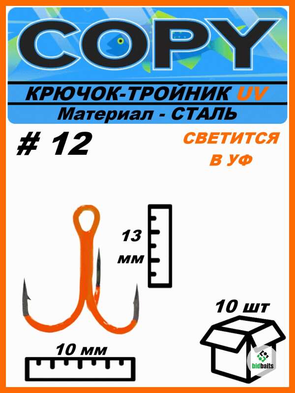 Крючок тройной светящийся UV оранжевый #12 (10шт)