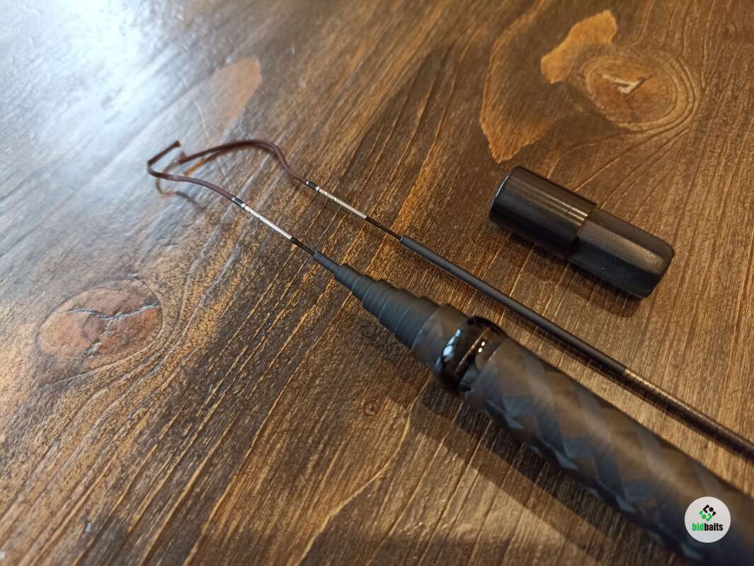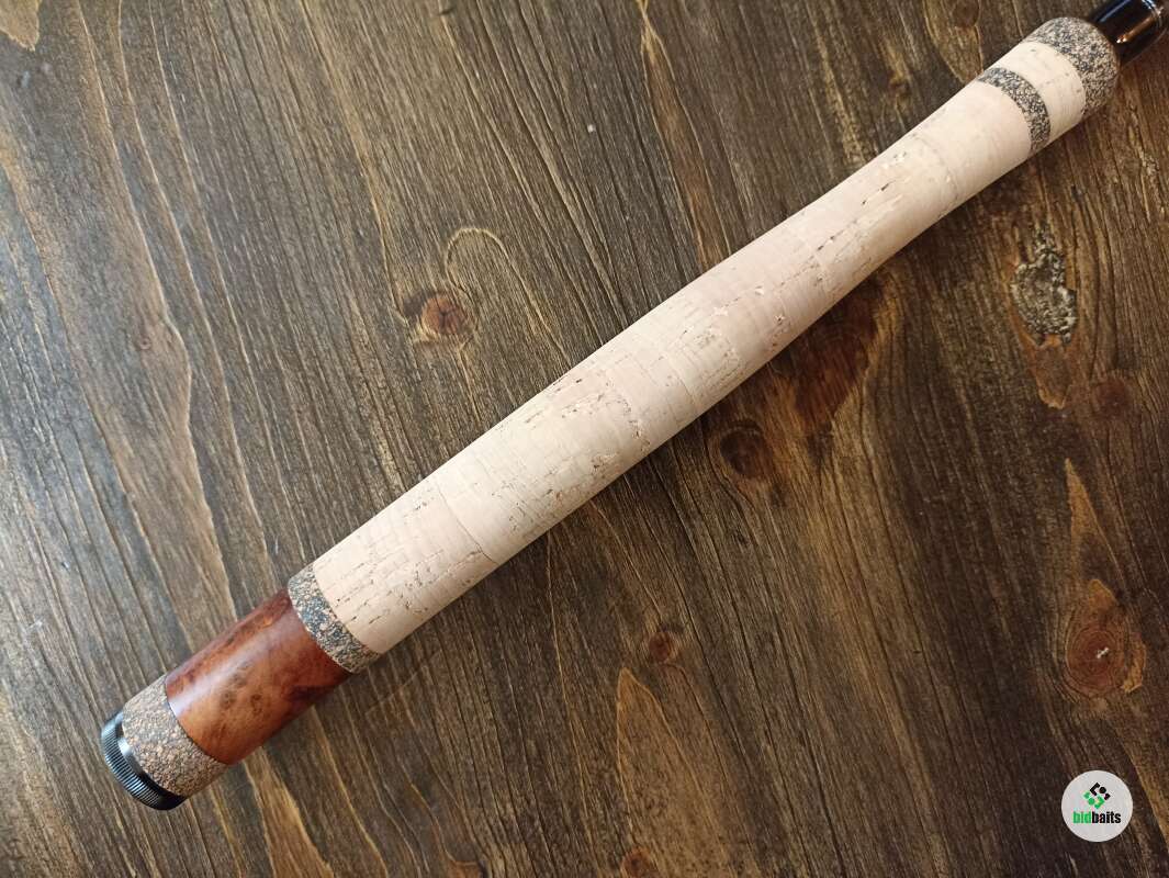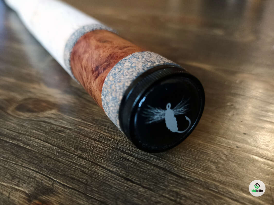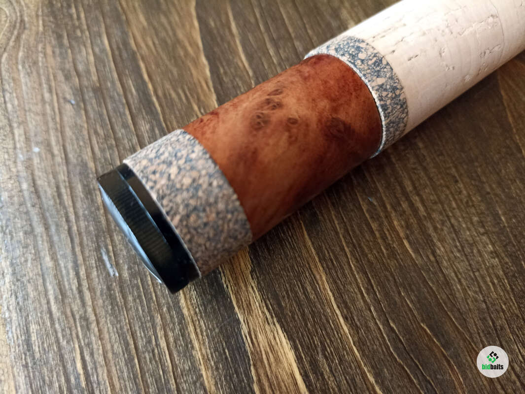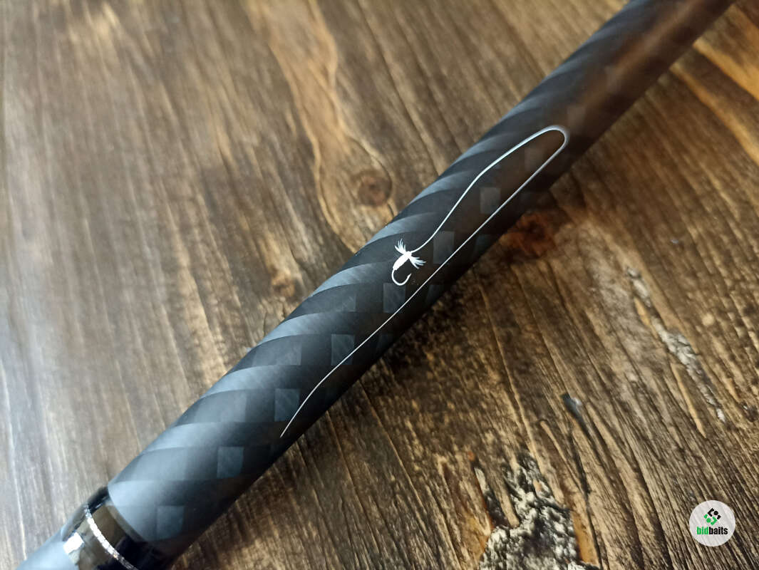 Бланк выполнен из нешлифованного карбона, нижние 2 секции из карбонового предпрега с укладкой волокон по 4-м осям. Устье нижней секции дополнительно усилено. Коннектор крепления оснастки на подшипнике. В комплект идет запасная вершинка и секция #2. Рукоять с обратным конусом и вставкой из натурального стабилизированного дерева. Мягкий транспортировочный чехол и тубус.