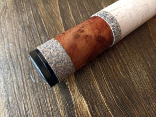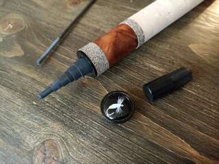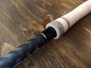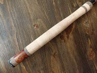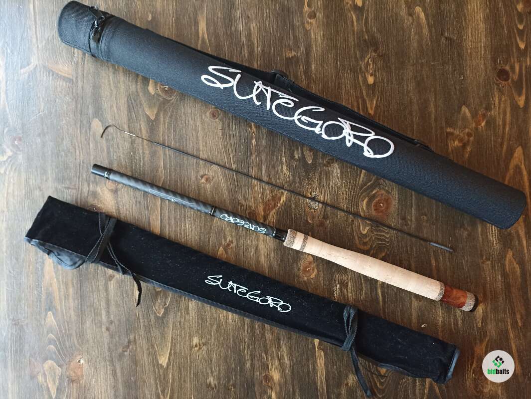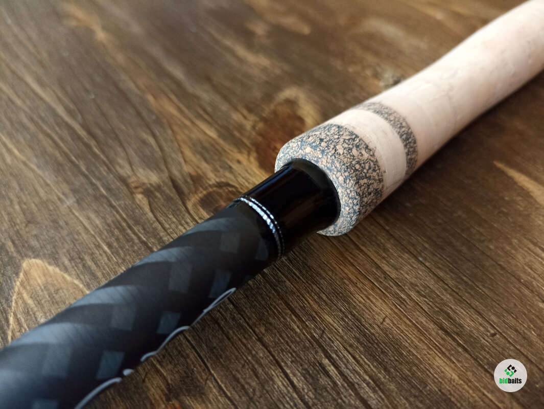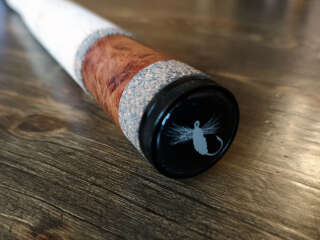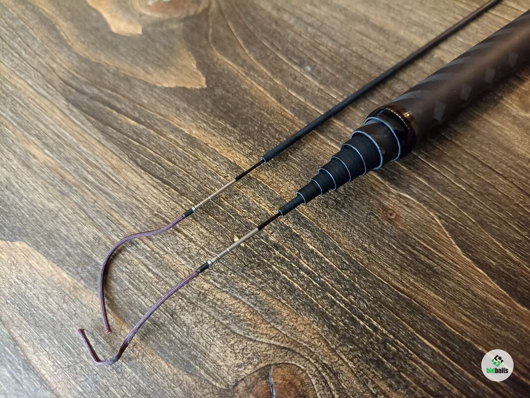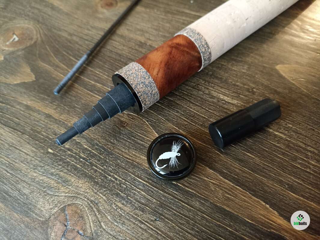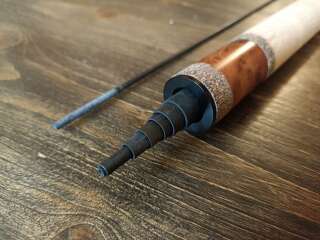 Бланк выполнен из нешлифованного карбона, нижние 2 секции из карбонового предпрега с укладкой волокон по 4-м осям. Устье нижней секции дополнительно усилено. Коннектор крепления оснастки на подшипнике. В комплект идет запасная вершинка и секция #2. Рукоять с обратным конусом и вставкой из натурального стабилизированного дерева. Мягкий транспортировочный чехол и тубус.