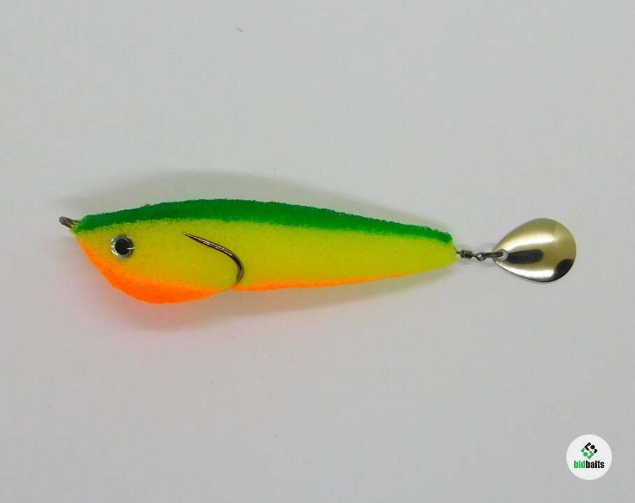 Приманка из поролона на двойнике Eagle Claw(прямое жало, длинное цевье) №1,0. Двойник слегка прижат к телу, что дает преимущество для ловли в корягах и не мешает реализации поклевок. При проводке лепесток начинает вращаться, а так же во время свободного падения, чего невозможно добиться никакими другими приманками. Тем самым привлекая к атаке любого хищника и некоторых видов мирных рыб. В окрасе присутствует флуоресцентная краска. Поролон живой, не печеный. Полностью ручная работа. Длина поролонового тела примерно 9см.