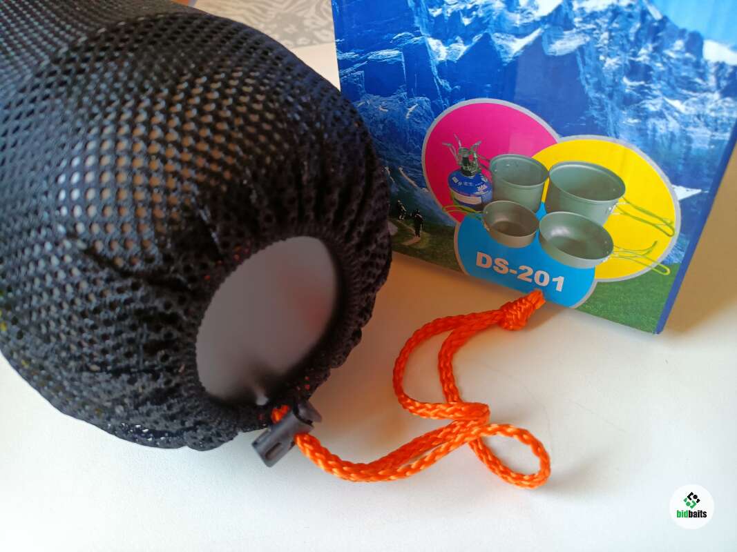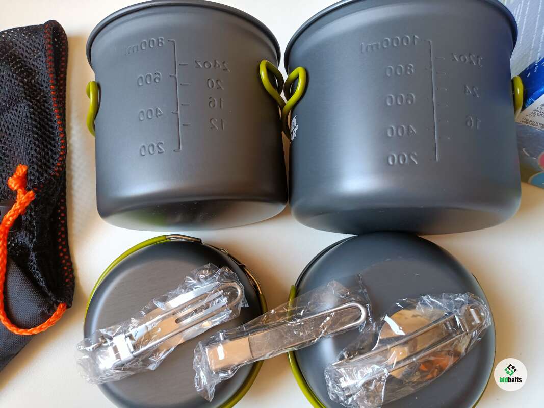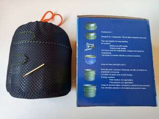 2 котелка (1000 мл. - 13 см. по дну, 800 мл. - 11.5 см. по дну), 2 крышки. Сетчатый чехол на затяжке с фиксацией.