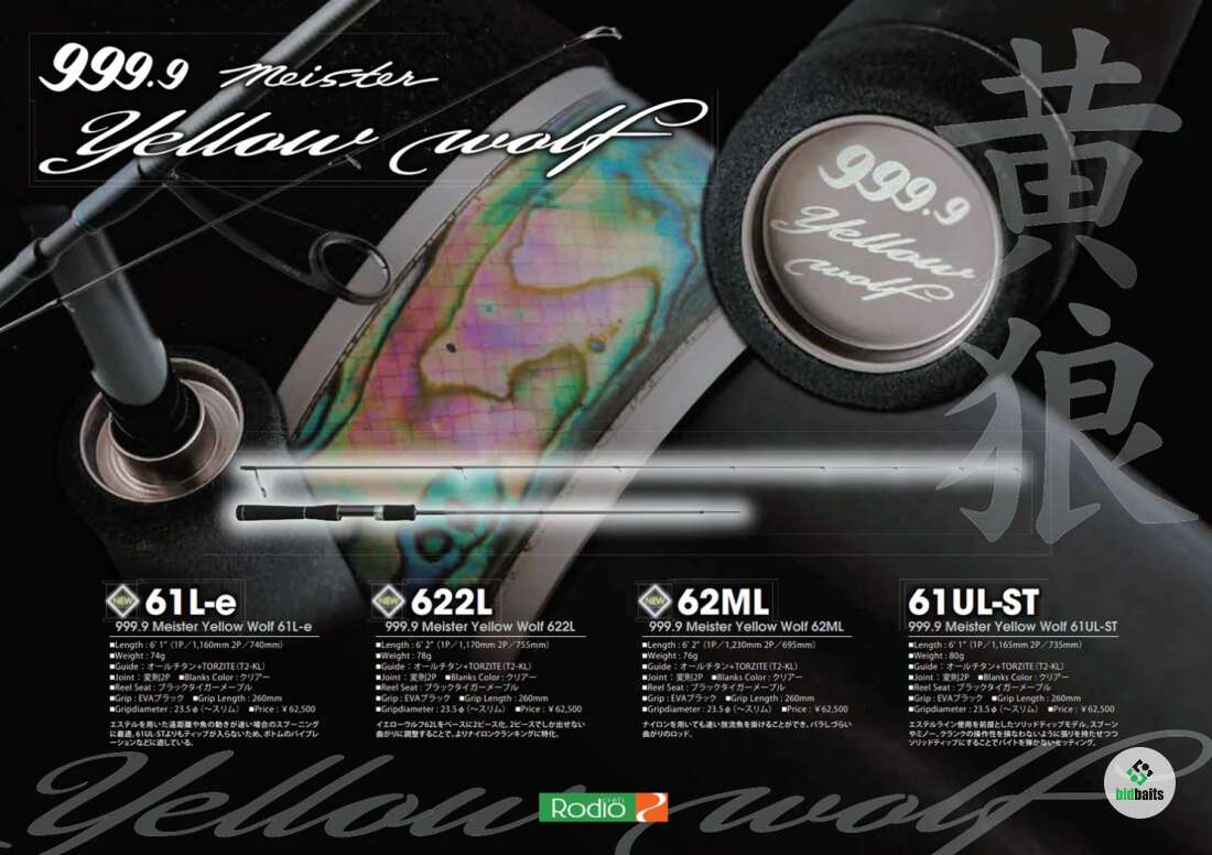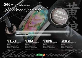 Yellow Wolf 61L-E – спиннинговое удилище премиального сегмента от японского бренда Rodio Craft. Особенность удилища заключатеся в том, что стык двух колен находится не посередине, а над рукоятью: одна треть спиннинга состоит из рукоятки и первой секции, оставшиеся две трети спиннинга составляют вершинку. При такой конструкции удалось добиться строя как у одночастника, при этом фактически является двухчастным удилищем. Удилище предполагает использование с эстером и PE шнурами. Отлично подойдет для блесен и воблеров. Поставляется в полужестком футляре с бархатной внутренней отделкой. Рукоять спиннинга выполнена из EVA, на бланке установлены кольца Fuji Titanium с вставками Torzite. Это удилище, разработано Родео Сано (Нобу), новая форма рукоятки серии Yellow Wolf имеет катушкодержатель толщиной 23,5 мм, что немного тоньше, чем у других моделей серии 999.9. Материал катушкодержателя: черный тигровый клен.