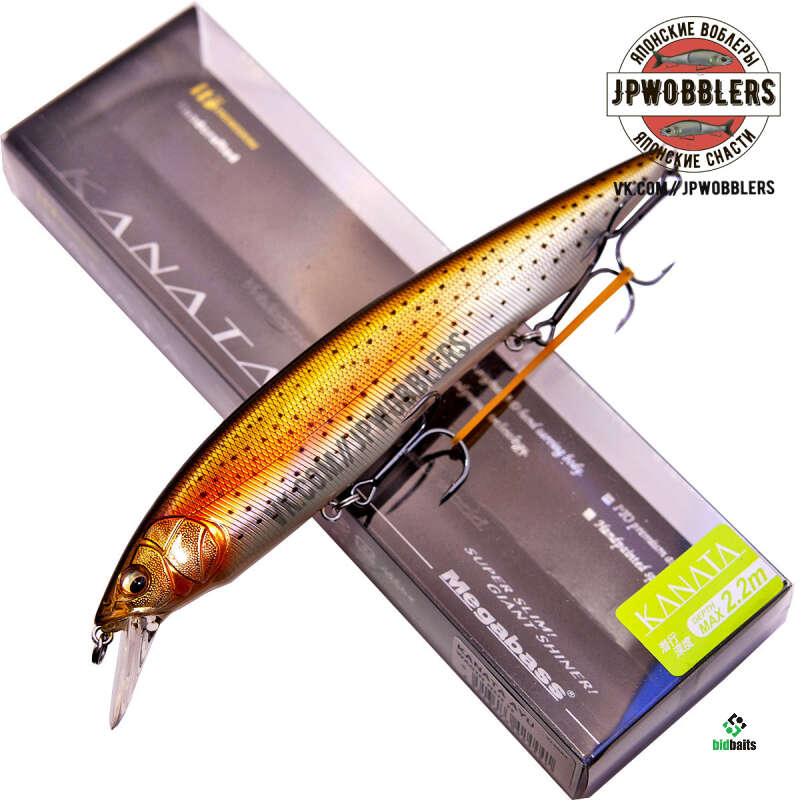 Японская компания Megabass расширила свой ассортимент объемных пластиковых приманок, выпустив воблер под названием Kanata . Это довольно таки крупная приманка длиною 16 см и весом 30 гр. Но ощущение громоздкости развеивается, когда берешь ее в руки. Дело в том, что при своей внушительной длине, Каната достаточно плоская - максимальная толщина составляет чуть более 1 см. Благодаря такому корпусу, минноу активно играет даже на простой равномерной проводке, при которой он демонстрирует плоские бока. Но самой лучшей анимацией является твичинг, при котором приманка широко мечется из стороны в сторону. Так же за игру отвечает лопатка оригинальной формы, определяющая горизонт заглубления в районе одного метра. Ну а чтобы увеличить дальность заброса и без того тяжелого воблера, внутри расположена простейшая система, состоящая из продольного канала с тремя тяжелыми шарами из металла. В качестве потенциального трофея стоит рассчитывать на крупную щуку, для удержания которой Kanata укомплектована мощными тройными крючками.