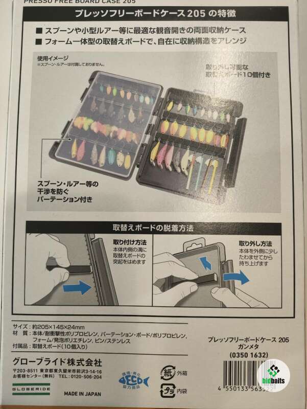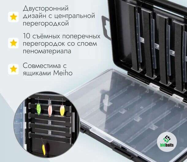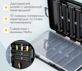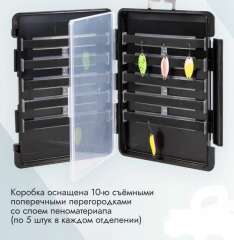 Внутреннее пространство рыболовной коробки оборудовано десятью съемными поперечными разделителями, каждый из которых имеет слой пеноматериала (по пять в каждом отсеке). Данное конструктивное решение позволяет надежно фиксировать крючки приманок непосредственно в пенистом слое перегородок, предотвращая их спутывание внутри кейса. Это значительно упрощает и ускоряет процесс извлечения приманок. Габариты коробки для блесен оптимизированы для размещения в специализированных ящиках, таких как Meiho BM-5000, а также в нижних отделениях моделей VS-7055N, VS-7070 и VS-7080 и др.