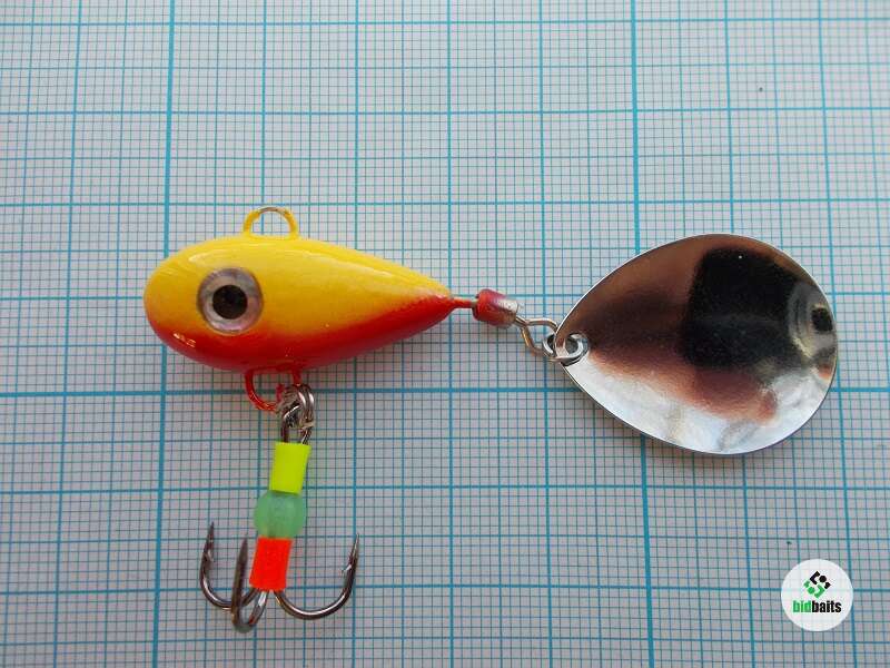 Вес 24 гр. Глаза вклеены в глазные ниши, это затрудняет хищнику повредить их и они будут долго оставаться привлекательной точкой для атаки. Тройник украшен яркими элементами и светонакопительной бусиной. Лепесток вращается ВСЕГДА, даже на падении.