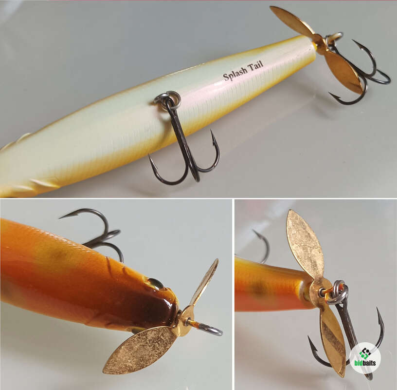 Особенностью пропбейтов серии Splash Tail - заявленное крепление двух пропеллеров приманки на вертлюжках со специальным шариковым подшипником. Благодаря применению такой оригинальной конструктивной находки, стало возможным обеспечение непрерывного вращательного действия механизма даже при самой медленной проводке.