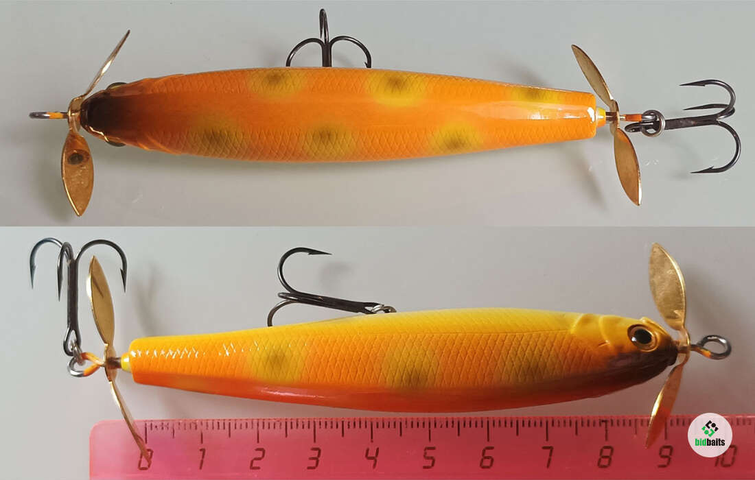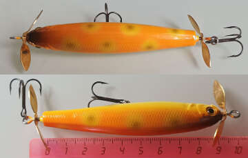 воблер в полном порядке; царапин нет; немного пятен на пропеллерах; задний пропеллер чуть менее крутится по времени. Возможно, просто лежал в мокрой коробке. На фото всё показал.