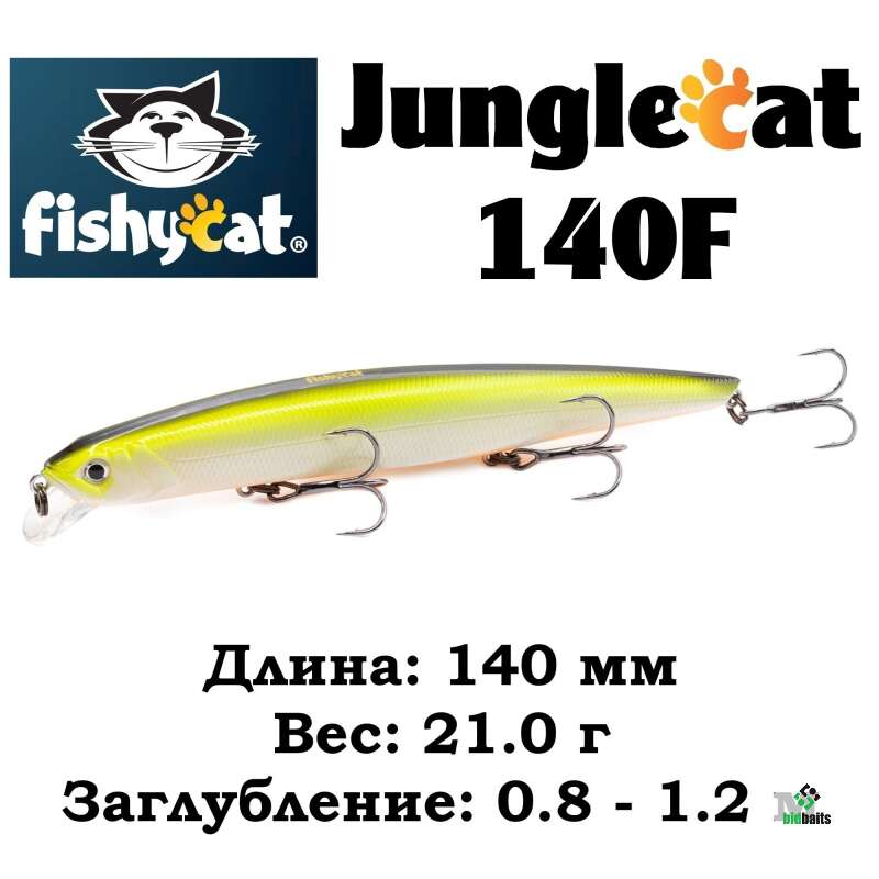 Модель «JUNGLECAT» создана для ловли на больших просторах. Выразительная игра не оставит равнодушным ни одного хищника. Отличная дальность заброса позволяет не спугнуть рыбу при облове удалённых участков. А возможность провести приманку на небольшой глубине над травой позволяет выманивать хищников из зарослей, где они часто прячутся. Всё это наиболее актуально при ловле пугливой рыбы на мелководных участках с прозрачной водой. Основным объектом ловли воблера Fishycat Junglecat 140F является щука, причем независимо от ее размера. При остановке проводки воблер поднимается к поверхности, таким образом, можно облавливать закоряженные места водоемов - излюбленные места обитания хищников. В отличии от версии Junglecat 140SP, плавающая модель играет более подвижно и выразительно, что приносит результат даже на равномерной проводке.