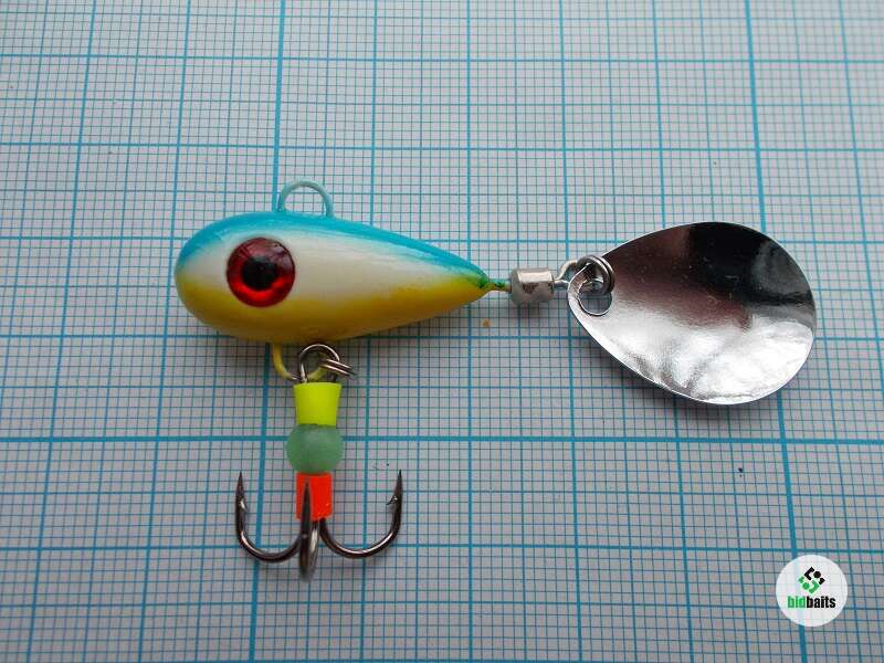 Вес 19 гр. Глаза вклеены в глазные ниши, это затрудняет хищнику повредить их и они будут долго оставаться привлекательной точкой для атаки. Тройник украшен яркими элементами и светонакопительной бусиной. Лепесток вращается ВСЕГДА, даже на падении.